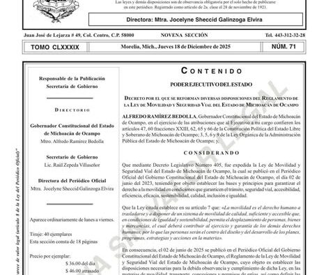 Morelia, Michoacán, 19 de diciembre de 2025.- El secretario de Gobierno, Raúl Zepeda Villaseñor, informó la publicación en el Periódico Oficial del Estado del decreto que reforma el Reglamento de la Ley de Movilidad y Seguridad Vial y elimina las multas e infracciones económicas de tránsito en Michoacán.