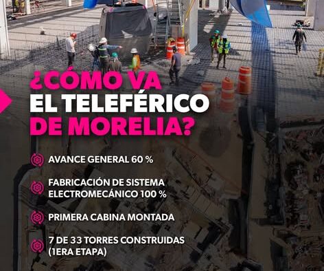 Morelia, Michoacán, 8 de diciembre de 2025.- La construcción del teleférico de Morelia avanza en un 60 por ciento, con un sistema electromecánico fabricado en un 98 por ciento y un avance promedio por estación superior al 50 por ciento, informó la secretaria de Desarrollo Urbano y Movilidad, Gladyz Butanda Macías.